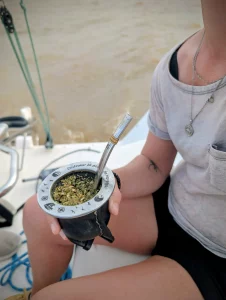 Das Nationalgetränk Argentiniens. Die getrockneten Blätter des Mate-Strauchs werden in einem speziellen Gefäß (Mate) mit heißem Wasser aufgegossen und durch ein Metall-Trinkrohr (Bombilla) getrunken. Mate zu teilen ist ein tief verwurzeltes soziales Ritual der Freundschaft und Gastfreundschaft.