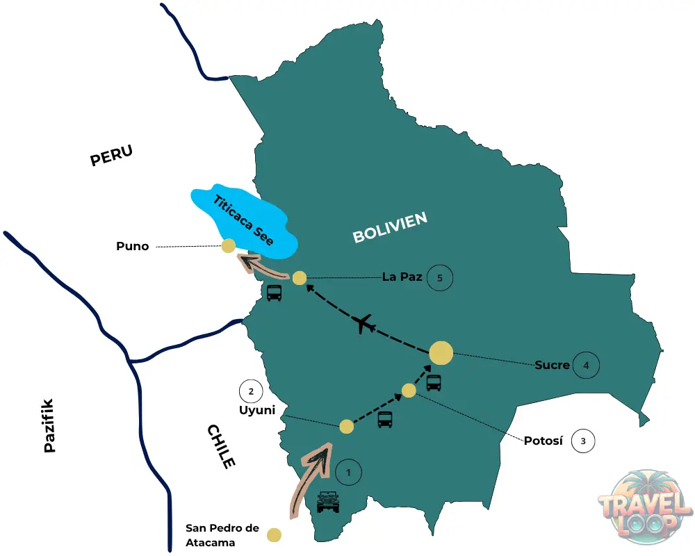 - Onwoard Ticket / Weiterreiseticket: Wird in Bolivien nicht benötigt. Es ist egal, ob das via Bus oder Flug passiert.