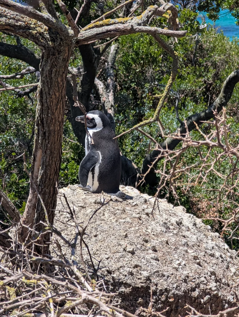 Danach fuhren wir wieder zurück Richtung Kapstadt und legten noch einen Zwischenstopp in Simons Town am Boulders Beach ein, dort wo es auch die bekannten süßen Pinguine aus Südafrika zu sehen gibt. Wir wollten aber nicht schon wieder Eintritt zahlen, noch dazu wo es von Touristen nur so wimmelt. Also liefen wir nur ein wenig auf einem kleinen Weg an der Küste entlang. Dort verstecken sich nämlich auch schon ein paar Pinguine, die man, wenn man Glück hat, von ganz Nahem sehen kann .