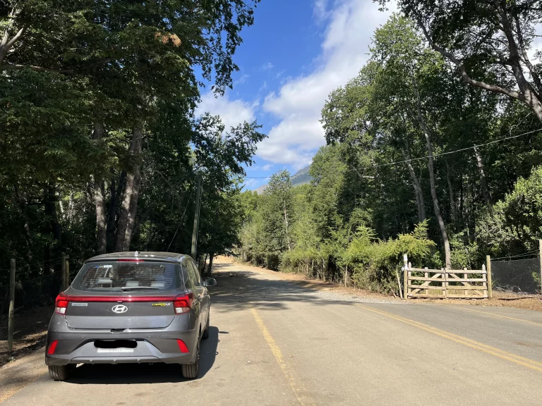 Wir haben in der Stadt Talca übernachtet und sind mit unserem Mietwagen die Straße / Ruta 115 bis nach San Clemente gefahren und dort auf die K-705 abgebogen in Richtung Vilches (Fahrtzeit ca. 1:15 Std.). Die Straße fahren wir bis zum asphaltierten Ende bevor sie in eine Schotterstraße übergeht. Vor der Schotterstraße parken wir unser Auto links am Straßenrand und gehen ca. 500 Meter bis zum Eingang des Parkes.